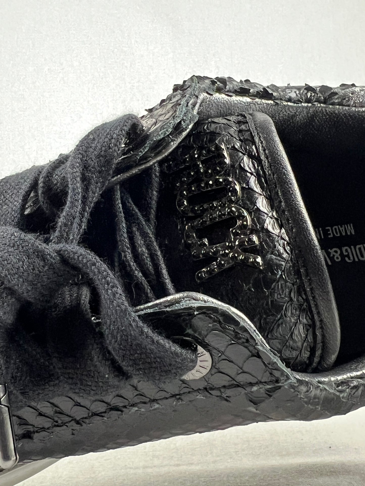 Deportivas de piel negra con efecto "cocodrilo" y tacón plateado, ofreciendo un estilo a la vez elegante y atrevido.