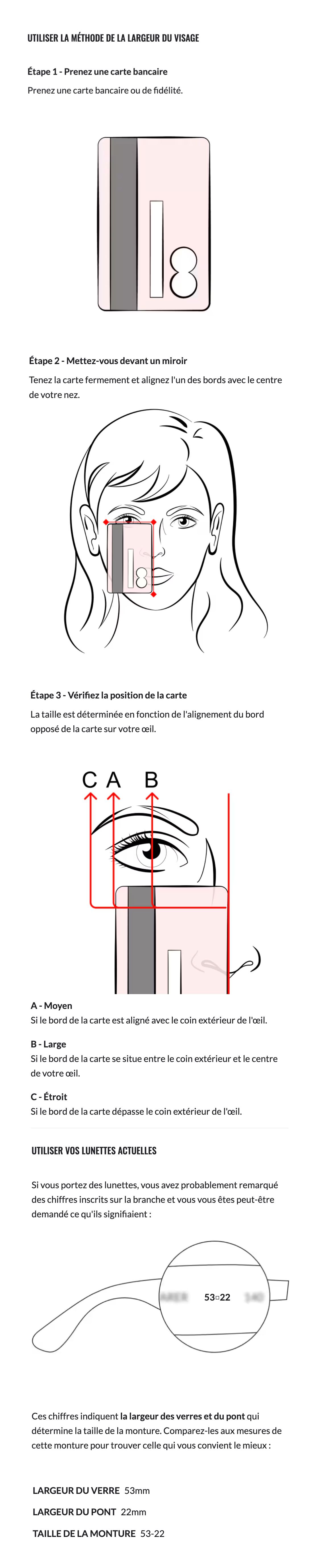 Trouvez votre taille idéale en mesurant la largeur du visage ou en vérifiant les numéros gravés sur la branche de vos lunettes.